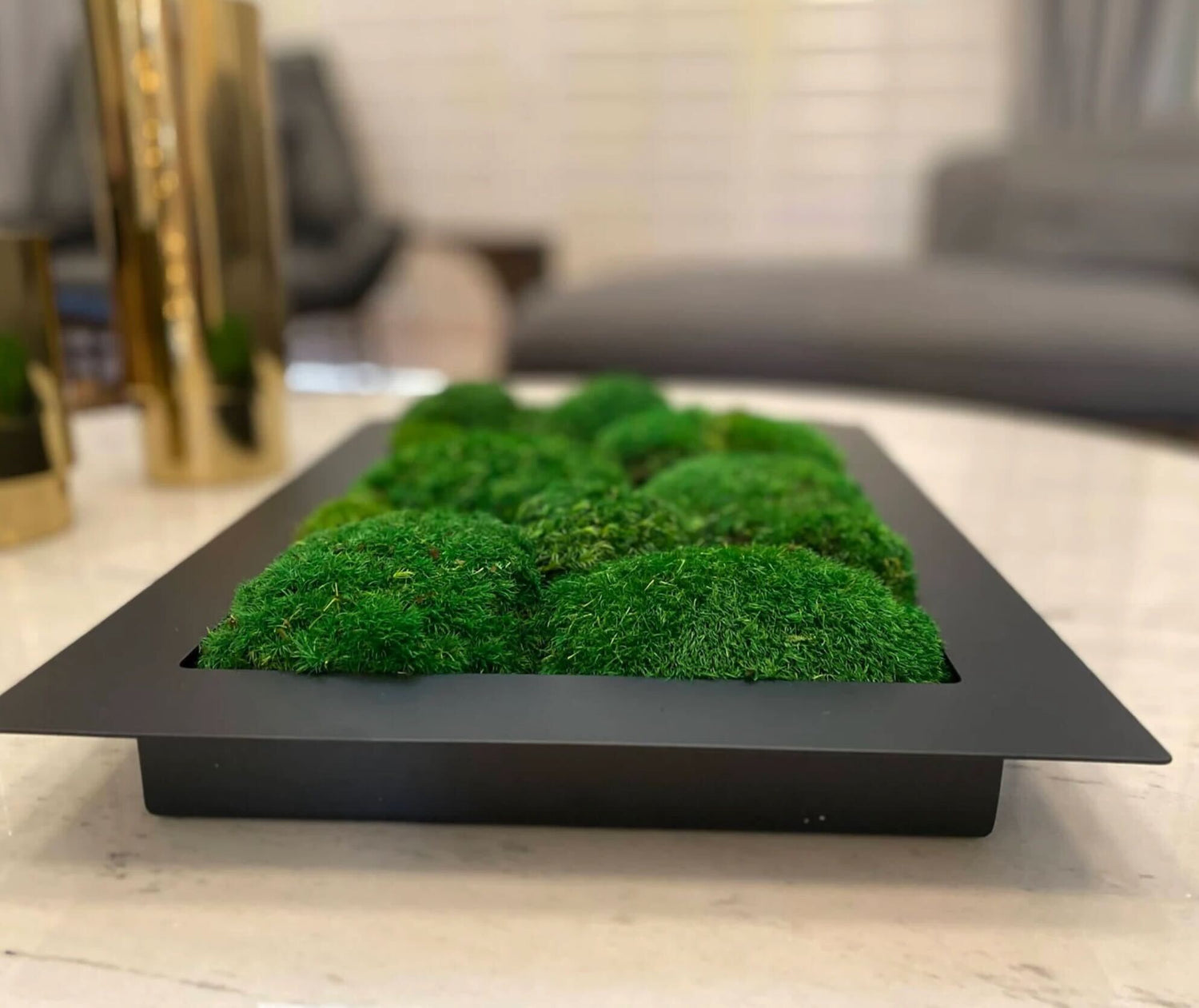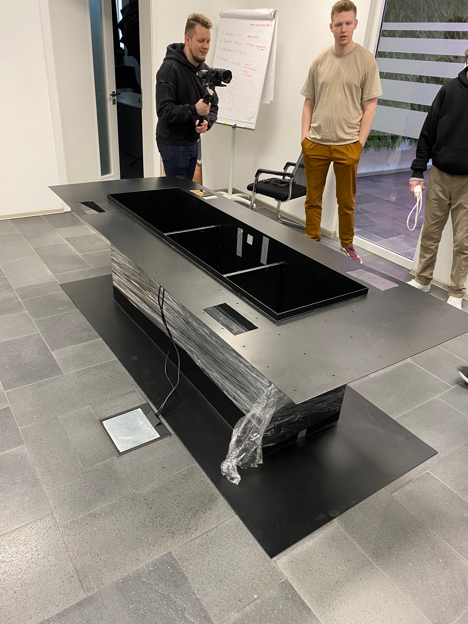 Bereits 4 Wochen nach Eingang der Anfrage von Nikita Yatsun machten wir uns auf den Weg. Im Gepäck der Tisch in seinen Einzelteilen und einige Helfer. Durch die gute Absprache war alles perfekt vorbereitet und wir konnten sofort mit der Arbeit beginnen. Als Erstes wurde das Gestell an seinen finalen Platz gestellt. Anschließend konnten wir die Verkabelung einrichten. Es folgt ein Test der Elektrik und der Kunde ist schon sichtlich glücklich. Als Nächstes brachten wir die 2 Tischplatten vor Ort und 'verheirateten' diese. Es fehlt nur noch der Mooseinsatz. Diesen letzten Schritt wollen wir dem Kunden überlassen, quasi die Kirsche auf der Sahnetorte. Et voilà, der Tisch steht da, in seiner vollen Pracht. Jetzt heißt es aufräumen und den Tisch noch einmal final wischen. Zu guter Letzt gab es noch eine Pflege Einweisung. Das echte Moos ist sehr pflegeleicht und überlebt bereits von der Luftfeuchte, nur bei besonders trockener Luft sollte man es gelegentlich mit Wasser befeuchten.