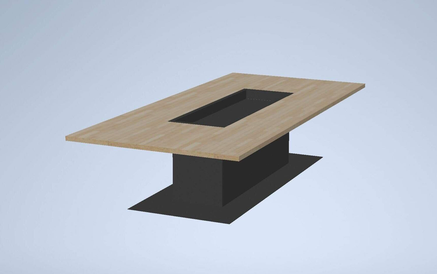 Für den Mooseinsatz brauchen wir eine speziell angefertigte Wanne aus Metall, die wir im Anschluss ebenfalls schwarz gepulvert haben. Weiterhin war dem Kunden wichtig, dass auch die ein oder andere Feier an diesem Tisch stattfinden kann. Somit haben wir auch eine Abdeckung für den Mooseinsatz aus Holz angefertigt. Somit steht einem Raclette Abend oder ähnliches nichts mehr im Weg und man kann die volle Fläche des Tisches nutzen.